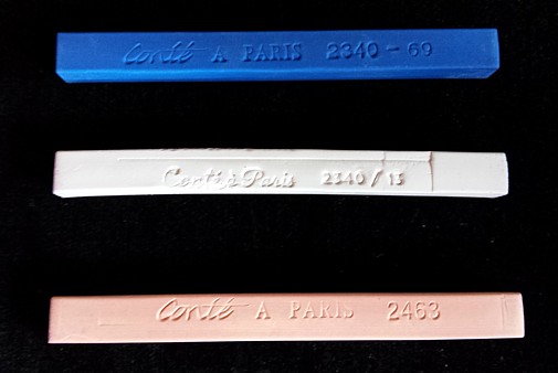 - Conte Crayons Composed of pigments, kaolin and binder, waxier and firmer than soft pastels, useful on grained surfaces.